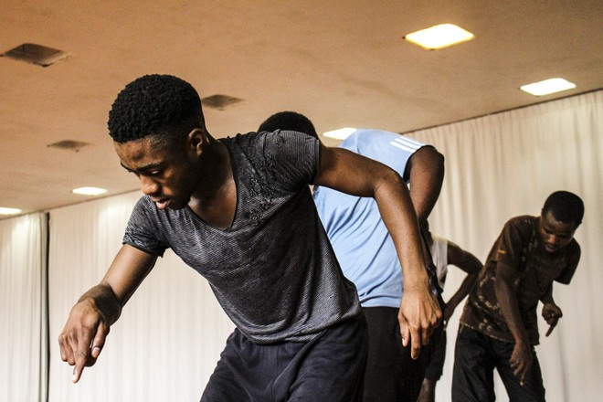Smangaliso Ngwenya concentrates on the dance move in rehearsal